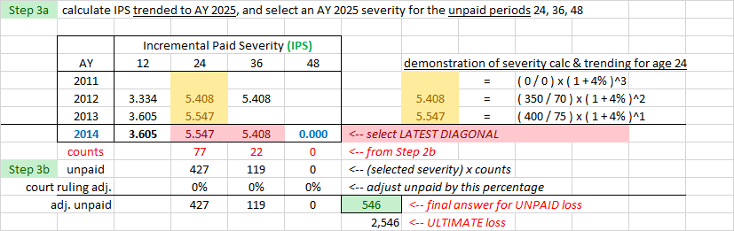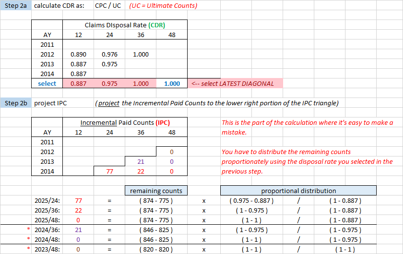 The only slight difference is how you make your selections for disposal rates in step 2a, and for severity in step 3a. In each case, you select the latest diagonal instead of an average. These values are shown highlighted in red in the solution below.