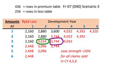 Following is an for the original reported triangle as well as the above mentioned scenario (which represents a 20% increase in case reserves in CY 4,5 and 6). Specifically let's consider the calculation behind CY 3, development period 2 and 3, both of which are eligible for case increase here.